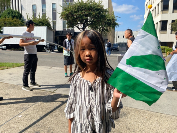 周三(1日)中午前后,洛杉矶中领馆前的抗议人群来了一拨又一拨。“没有国庆,只有国殇!”“结束中共,还我人权!”……声声呐喊在两百米外另一条街道上就可听到。现场群情激愤,抗议者拉出长长的黑色横幅,上书“十一沦陷日,结束中共暴政”。