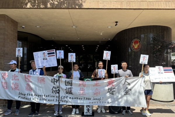 中国异议作家杜导斌的侄子乐在霖也告诉大纪元,他们之前到泰国驻洛杉矶的使馆表达诉求,希望泰国不要遣返周俊义。中国民主党有专人在跟,“如果中共有进一步的行动的话,我们还要再发起第二次、第三次的专场声援的。”
